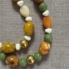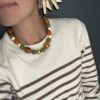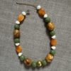 Collier ultra tendance composé de perles en résine de différentes tailles et formes, dans des couleurs olive, ambre, écru et brun.